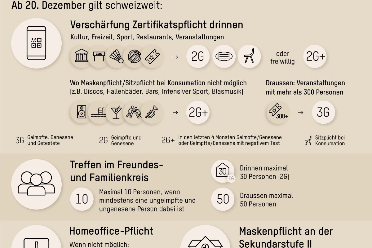 Ab Montag, 20. Dezember 2021, gelten in der Schweiz verschärfte Massnahmen gegen die Ausbreitung des Coronavirus. Zu Innenräumen von Restaurants, von Kultur-, Sport- und Freizeitbetrieben sowie zu Veranstaltungen im Innern haben nur noch geimpfte und genesene Personen Zugang (2G). Damit wird das Risiko reduziert, dass nicht immunisierte Personen infiziert werden. Sie geben das Virus leichter weiter und erkranken viel häufiger schwer. Als zusätzlicher Schutz muss an diesen Orten eine Maske getragen und es darf nur im Sitzen gegessen und getrunken werden. Wo die Maske nicht getragen werden kann, wie bei Blasmusikproben, oder wo nicht im Sitzen konsumiert werden kann, wie in Discos und Bars, sind nur noch geimpfte und genesene Personen zugelassen, die zusätzlich ein negatives Testresultat vorweisen können (2G+). Personen, deren Impfung, Auffrischimpfung oder Genesung nicht länger als vier Monate zurückliegt, sind von dieser Testpflicht ausgenommen. Ausserdem gilt erneut eine Homeoffice-Pflicht. Private Treffen sind auf zehn Personen beschränkt, falls eine Person ab 16 Jahren dabei ist, die nicht geimpft oder genesen ist. Dies hat der Bundesrat an seiner Sitzung vom 17. Dezember 2021 entschieden. Der Bundesrat hat zudem die Übernahme der Testkosten geregelt und die Beschaffung zusätzlicher Impfdosen beschlossen.