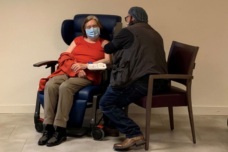 Im Kanton Glarus wird seit dem 5. Januar 2021 in Alterszentren gegen COVID-19 geimpft. Die 90-jährige Iris Jaumann wurde als erste Glarnerin von Heimarzt Piero l'Abate geimpft.