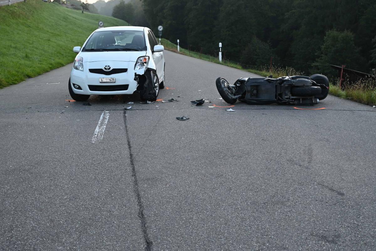 Aus bislang unbekannten Gründen geriet sie dabei mit ihrem Auto auf die Gegenfahrbahn. Trotz eingeleiteter Vollbremsung durch den 41-jährigen Motorradfahrer kam es zur Kollision mit dem Auto der 22-Jährigen. Durch den Aufprall wurde der 41-Jährige leicht verletzt. Das medizinische Fachpersonal brachte ihn ins Spital. Es entstand Sachschaden von mehreren tausend Franken.