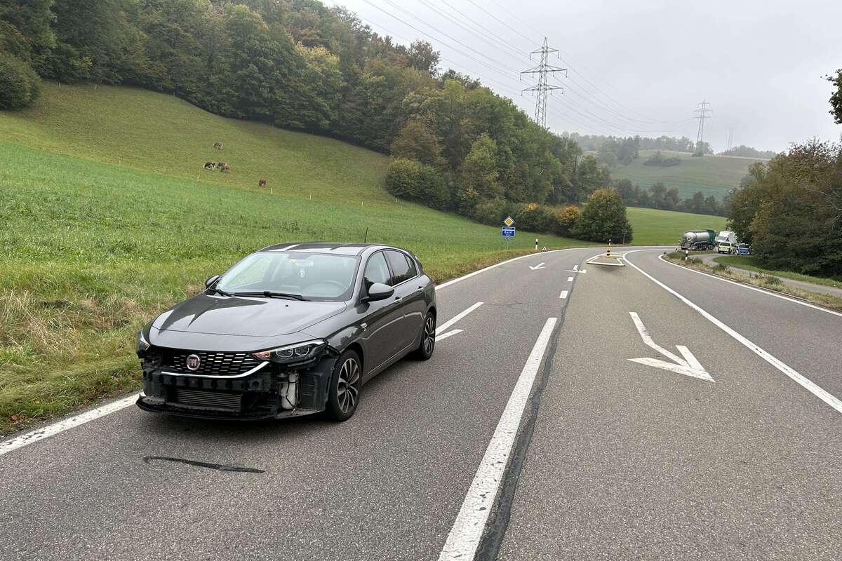 Der Unfall ereignete sich am Dienstag, 17. Oktober 2023, um zehn Uhr auf der Ausserortsstrecke zwischen Herznach und Densbüren. In Richtung Densbüren fahrend wollte die 55-jährige Lenkerin eines Fiat einen landwirtschaftlichen Traktor angekuppeltem Druckfass überholen. In diesem Augenblick näherte sich in Gegenrichtung ein Anhängerzug. Die Automobilistin merkte, dass es knapp werden könnte und wollte das Manöver abbrechen. Dabei streifte sie den Anhänger des Traktors.