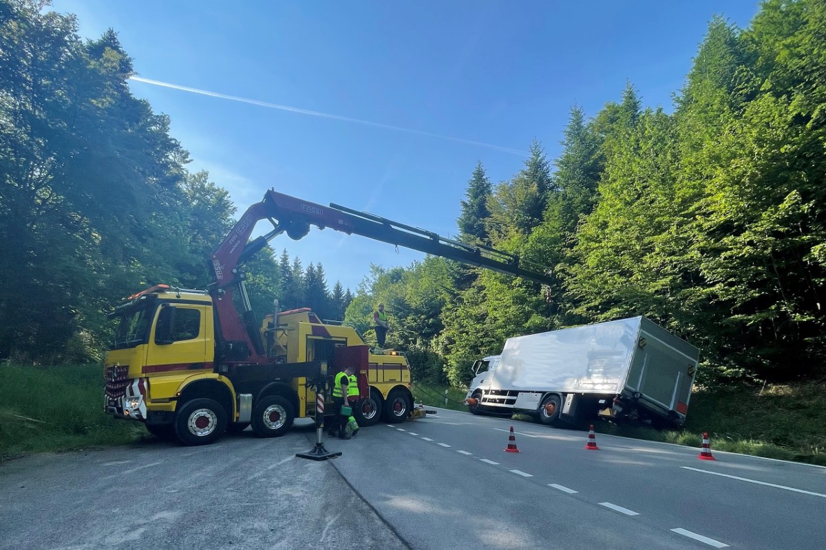 In Dieterswil BE ist ein Lastwagen in Schräglage geraten. (Bildquelle: Kantonspolizei Bern)