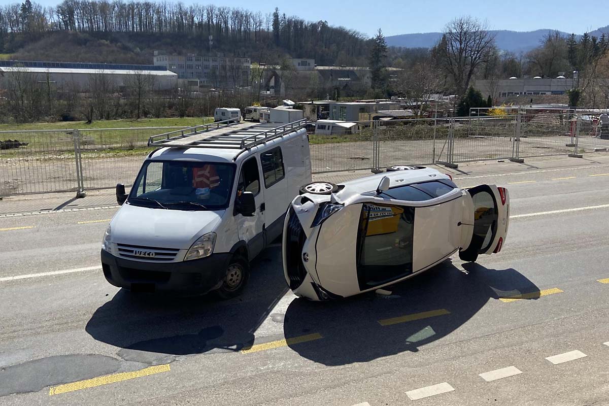 Ein nachfolgender Personenwagenlenker wollte das Rechtsausholen zum Überholen nutzen. Folglich kollidierte das überholende Fahrzeug frontal/seitlich mit dem abbiegenden Lieferwagen und kam schlussendlich, auf der Seite liegend, zum Stillstand.
