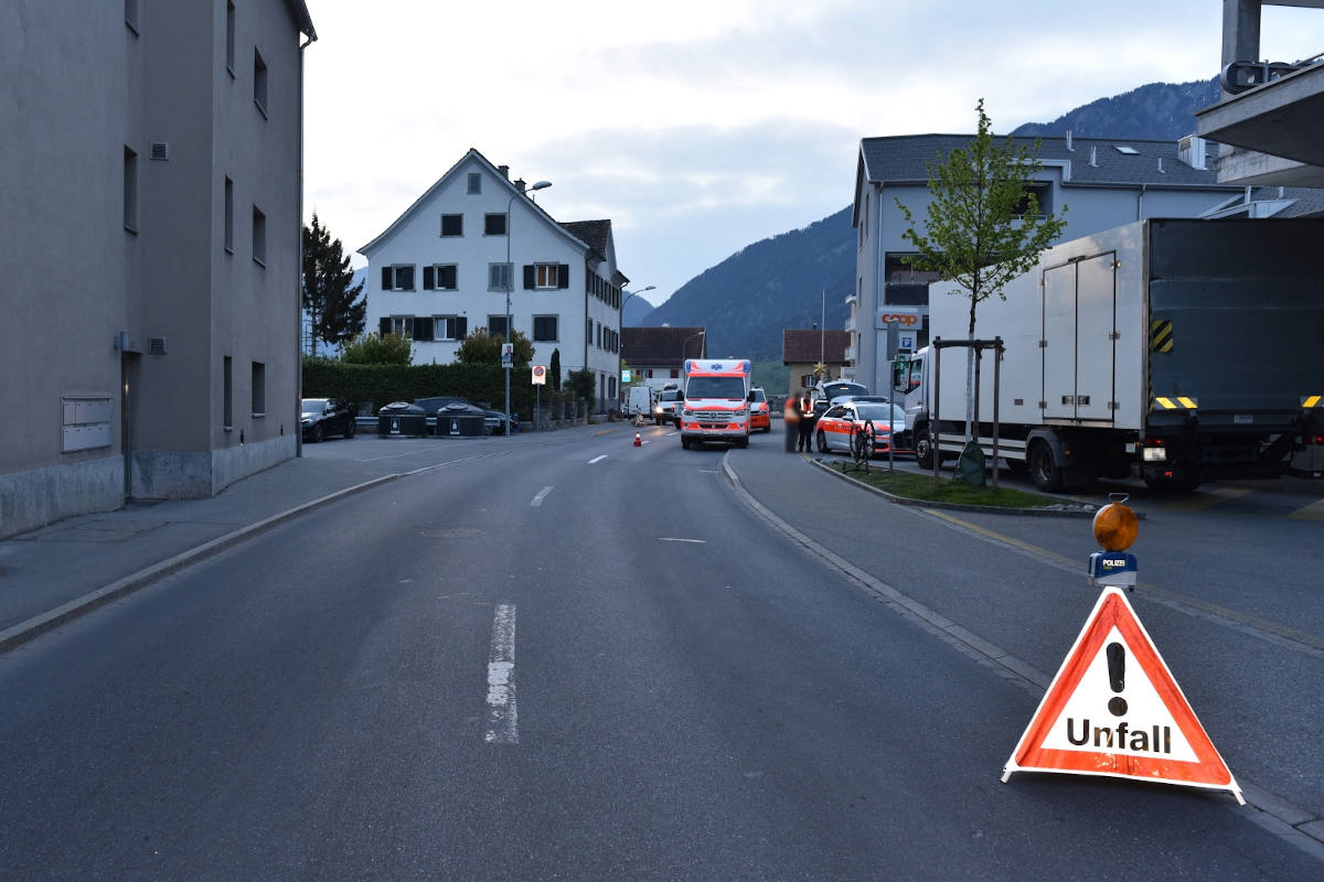 Am frühen Freitagmorgen ist auf der Italienischen Strasse in Domat/Ems ein Fahrrad einem Lastwagen aufgefahren. Der Fahrradfahrer verletzte sich dabei mittelschwer.