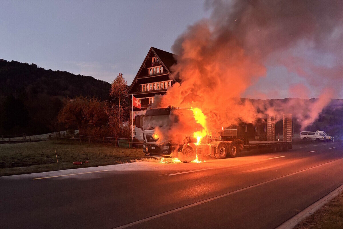 Ein 35-jähriger Mann fuhr mit seinem Lastwagen auf der Umfahrungsstrasse, als er einen Knall aus der Fahrzeugfront hörte. Daraufhin hielt er den Lastwagen an und verliess die Fahrerkabine. Kurze Zeit später entstand darin ein Feuer. Bei der Ankunft einer Patrouille der Kantonspolizei St.Gallen war der Lastwagen bereits in Vollbrand. Die ausgerückte Feuerwehr konnte den Brand löschen. Es entstand Sachschaden im Wert von rund 90'000 Franken.