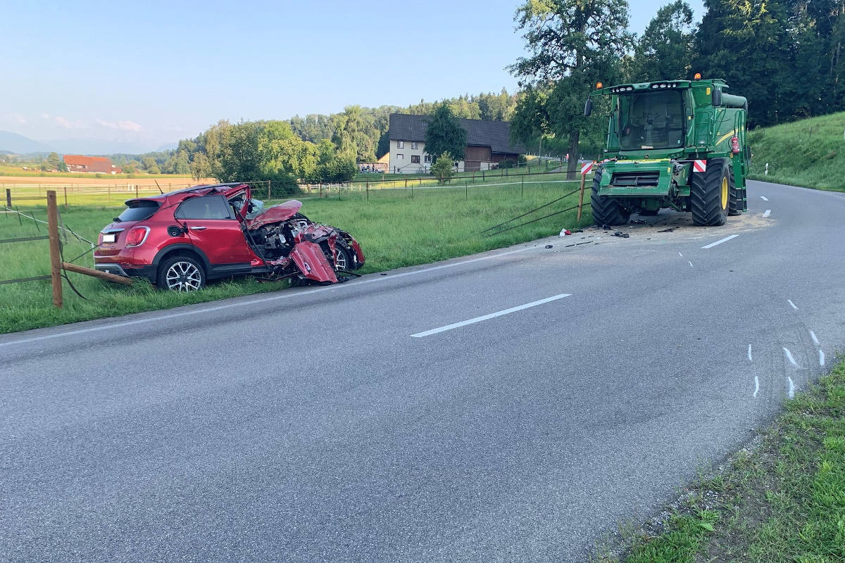 Am Personenwagen entstand Totalschaden und am Mähdrescher sowie an einem Zaun und der Strasseneinrichtung Sachschaden von mehreren Tausend Franken.