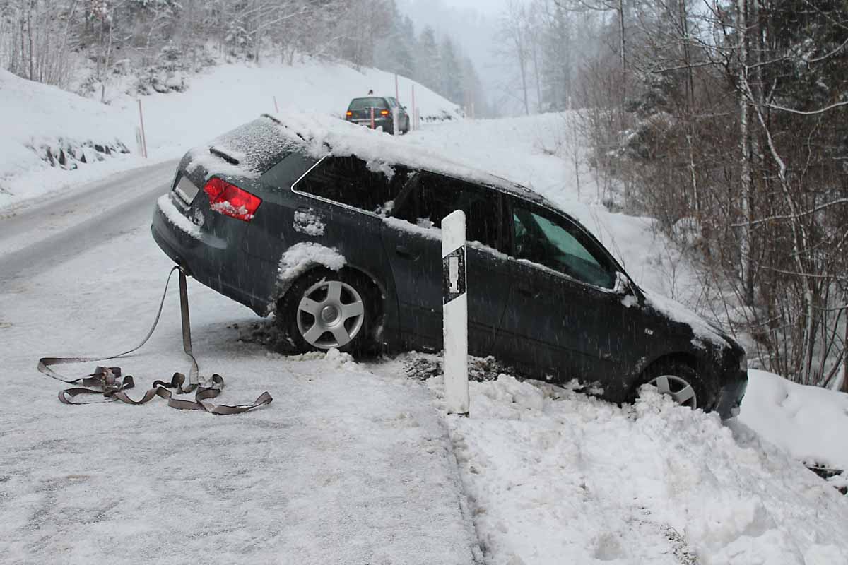 In einer Linkskurve verlor er gestern auf der schneebedeckten Strasse die Herrschaft über sein Fahrzeug und rutschte über den Strassenrand hinaus.