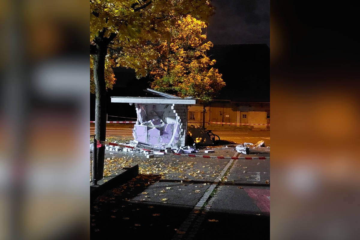 Am 11.10.2022 kurz nach 0230 Uhr erhielt der Polizeinotruf einen Alarm, wonach ein Bankomat aufgesprengt wurde. Anwohner, welche sich zeitgleich telefonisch meldeten, bestätigten die Explosion. Umgehend wurden mehrere Patrouillen der Kantons- und Regionalpolizei aufgeboten. In der Aussenmauer des freistehenden Gebäudes, in welchem der Geldautomat eingebaut war, zeigte sich ein Bild der Zerstörung. Der Vorplatz und die angrenzende Strasse waren mit Trümmern übersäht. Die Höhe des Schadens lässt sich noch nicht beziffern.