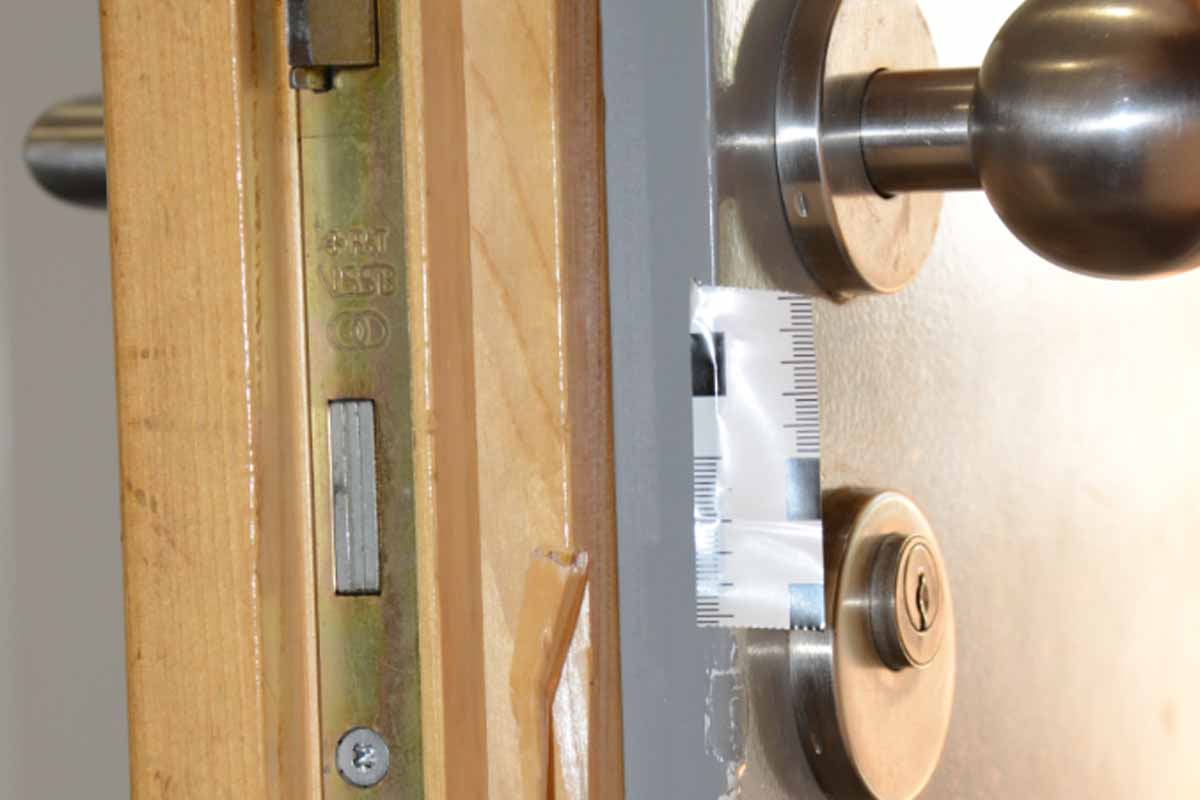 Die Täterschaft hebelte in Nendeln mit Zuhilfenahme eines unbekannten Flachwerkzeuges die Haupteingangstüre auf (Bildquelle: Landespolizei Fürstentum Liechtenstein)
