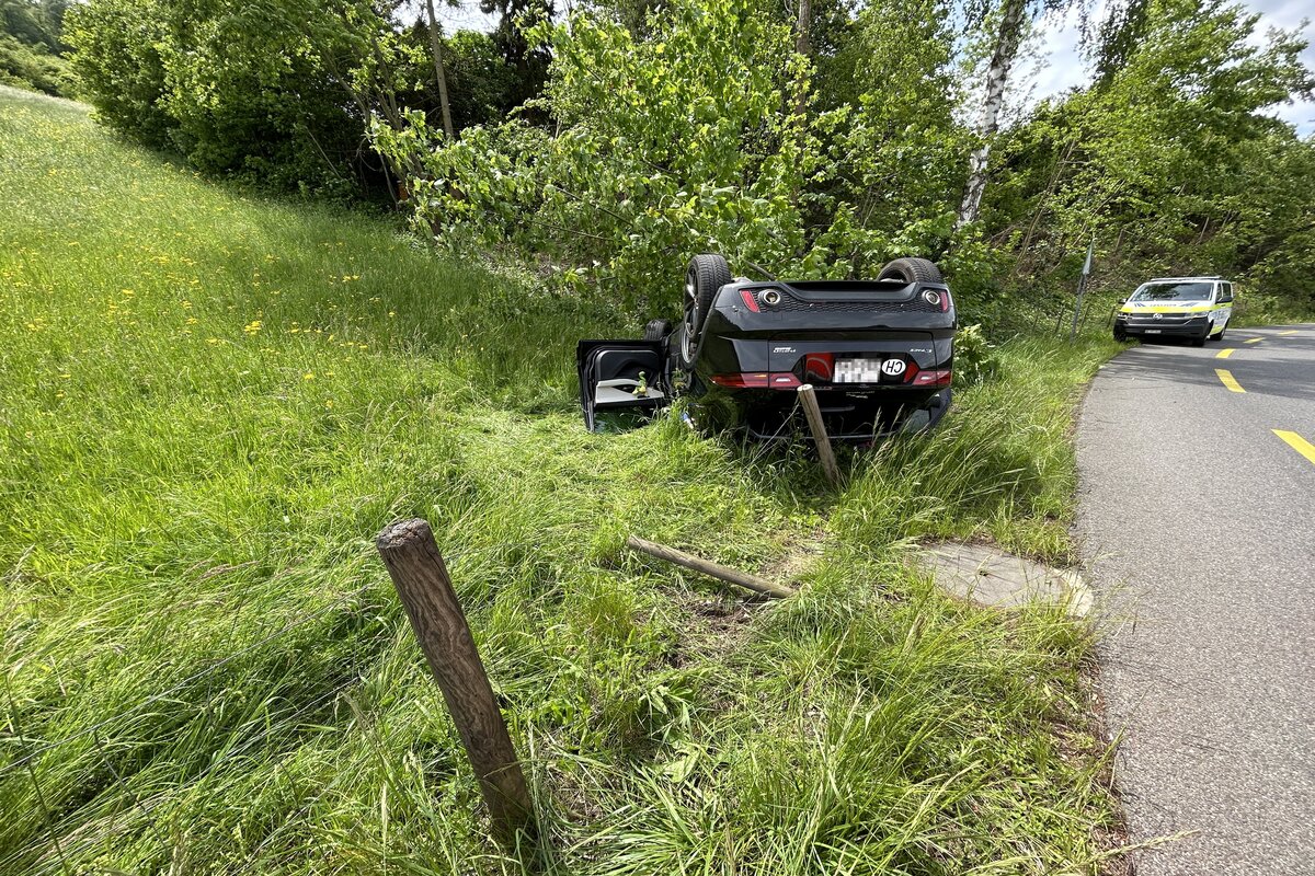 Die Beifahrerin im Jaguar versuchte noch, das Auto unter Kontrolle zu bringen, was jedoch nicht mehr klappte. Der Jaguar kam von der Strasse ab und landete auf dem Dach.