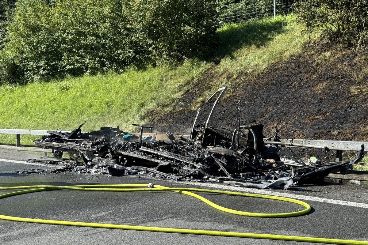 Heute Montag, 8. Juli 2024, kurz nach 08.30 Uhr, fuhr der Lenker eines Fahrzeugs mit deutschen Kontrollschildern mit angehängtem Wohnanhänger auf der A2 in Fahrtrichtung Süden. Aus noch nicht abschliessend geklärten Gründen platzte im Taubachtunnel am Anhänger ein Reifen. Dem 39-jährigen Lenker des Fahrzeugs gelang es, die Fahrzeugkombination aus dem Tunnel zu fahren, worauf der Anhänger aus noch ungeklärten Gründen in Brand geriet. Der Lenker konnte den Anhänger abkoppeln, bevor dieser in Vollbrand geriet und in Folge komplett ausbrannte.