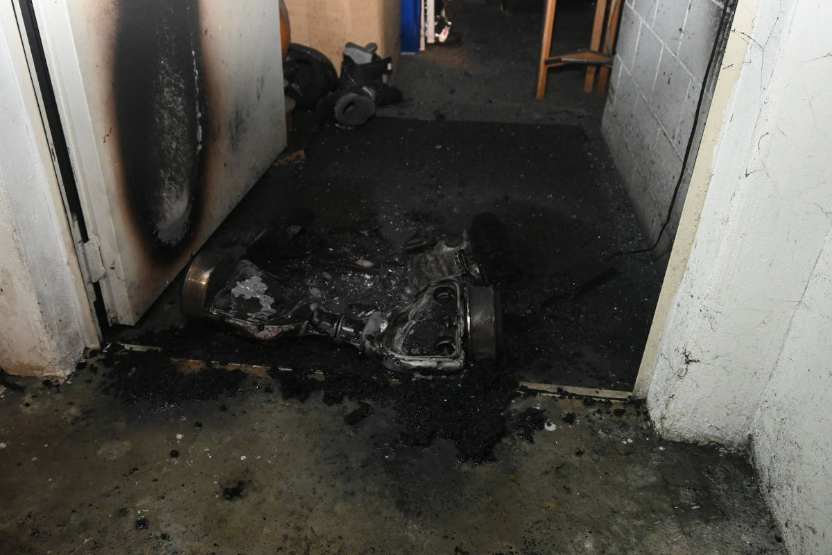 Gegen 19:30 Uhr kam es in einem Kellergeschoss eines Mehrfamilienhauses aufgrund eines technischen Defektes beim Ladevorgang eines Hoverboards zu einem Kurzschluss im Akku. In der Folge gab es eine so starke Wärme- und Rauchentwicklung, dass ein daneben befindliches Hoverboard ebenfalls schmolz.