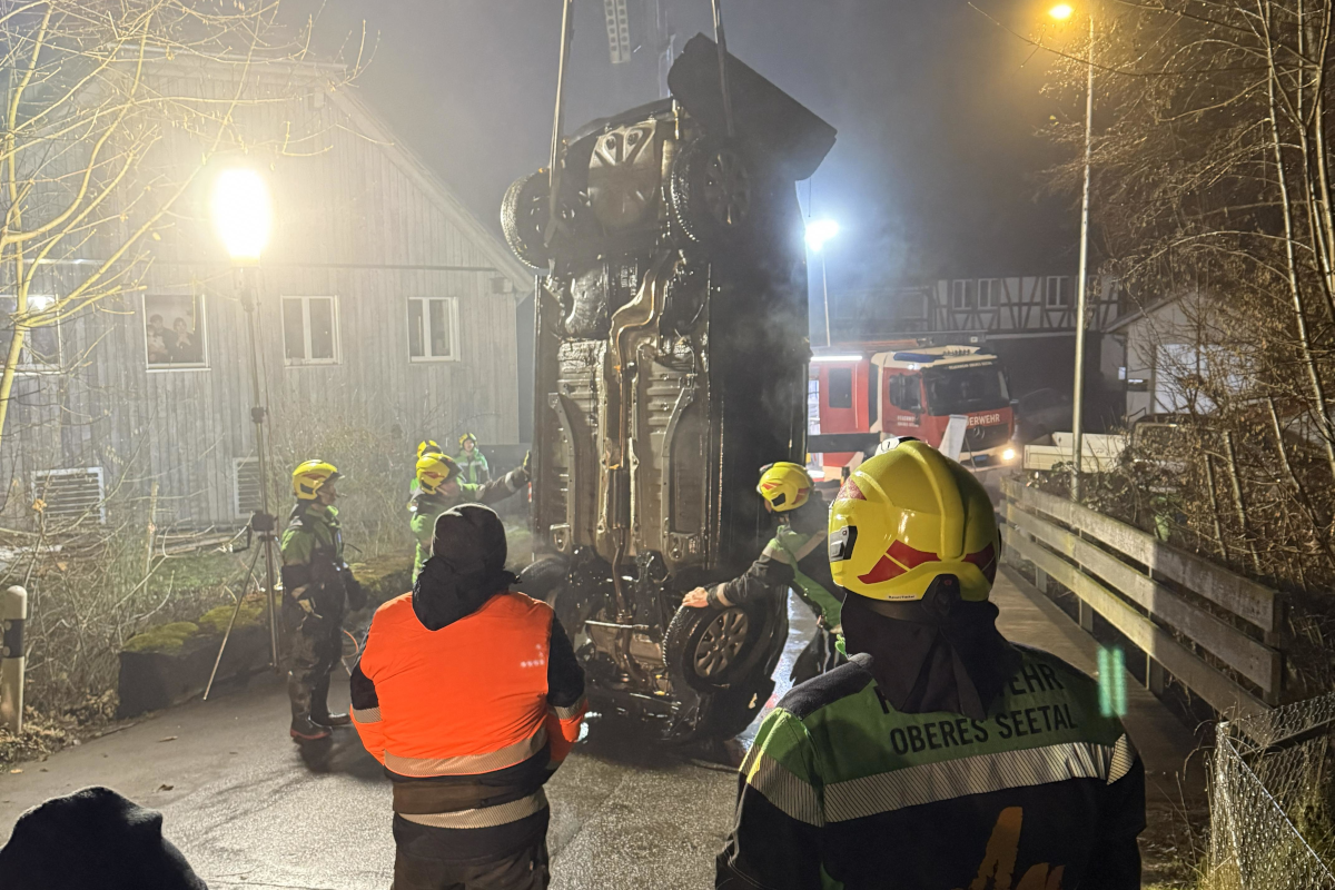 Am Samstag, 13. Dezember 2025, stürzte ein Auto in Fahrwangen in den Dorfbach und blieb auf dem Dach liegen. Ein Anwohner konnte den Lenker aus dem Wagen befreien.