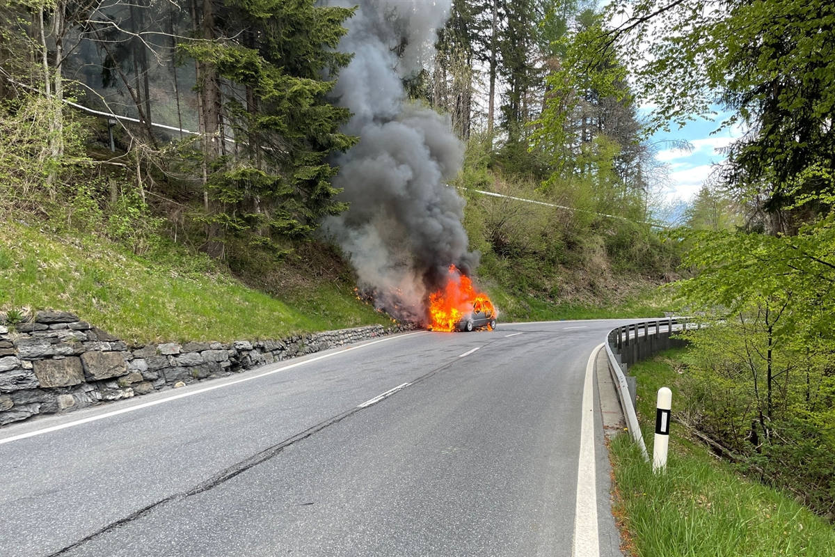 Ein Autolenker fuhr am Sonntagabend auf der Julierstrasse H3 von Chur bergwärts in Richtung Malix. Kurz vor 18.30 Uhr stellte er Brandgeruch fest und wurde von entgegenkommenden Fahrzeugen mittels Lichthupe und akustischer Hupe darauf aufmerksam gemacht, dass etwas nicht stimmt. Der Lenker hielt an und verliess das Fahrzeug, welches kurz darauf in Brand geriet.