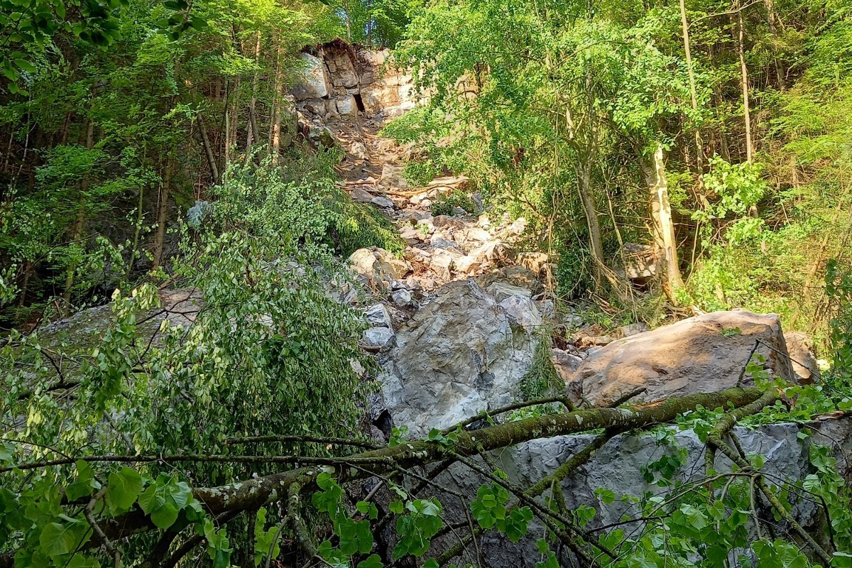 Die grössten gelösten Felsblöcke sind so gross wie etwa ein Auto. Die Ausbruchzone wird weiterhin als instabil beurteilt, weshalb kleinere Nachbrüche nicht ausgeschlossen werden können. Das Anrissgebiet wurde deshalb grosszügig abgesperrt. Das Auslaufgebiet ist weitläufig, wir bitten die Bevölkerung deshalb, das Gebiet Steiloch und Ziegelhütte zu meiden und auf dem Berglihügel bis auf Weiteres nur offizielle Wege zu benützen.