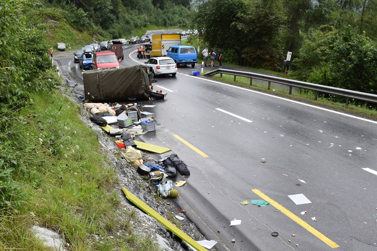 Am Samstag kurz vor 15.45 Uhr fuhr der 28-jährige Fahrzeuglenker zusammen mit drei Begleitpersonen mit seinem Fahrzeug mit Anhänger auf der Oberalpstrasse von Sagogn kommend talwärts in Richtung Trin. Eingangs einer Rechtskurve nach dem Verlassen des Flimsersteintunnels, geriet der Lieferwagen in eine unruhige Fahrweise und kippte auf die linke Seite. Der Lieferwagen rutschte bis zum Stillstand einige Meter auf der Gegenfahrbahn weiter. Der Sachentransportanhänger wurde vom Zugfahrzeug abgerissen, rollte 40 Meter auf der Gegenfahrbahn weiter und blieb in der bergseitigen Böschung stecken.