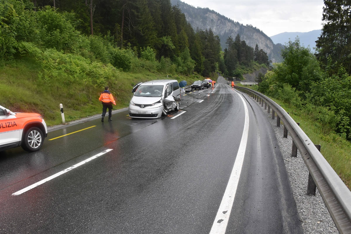 Kurz nach 16 Uhr geriet ein Richtung Trin fahrender 61-jähriger Personenwagenlenker ausgangs einer Linkskurve auf die Gegenfahrbahn. Dort kollidierte er mit drei entgegenkommenden Personenwagen. Der in Richtung Trin Fahrende sowie die 56-jährige Lenkerin eines der entgegenkommenden Fahrzeuge verletzten sich leicht. Ein Ambulanzteam der Rettung Chur überführte beide ins Kantonsspital Graubünden. Drei der vier beteiligten Fahrzeuge wurden total beschädigt. Die Kantonspolizei Graubünden ermittelt die Unfallursache.