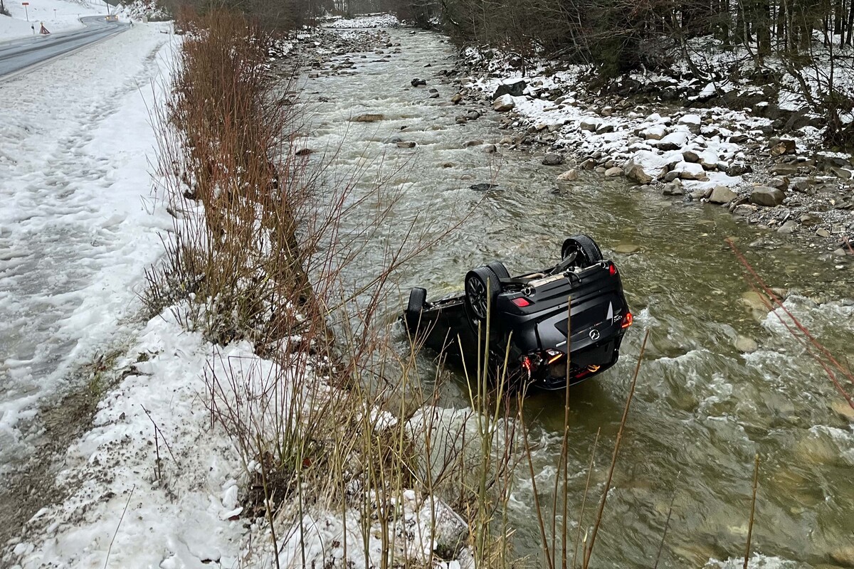 Am Dienstagmorgen kam zwischen Flühli und Sörenberg ein Auto von der Strasse ab und stürzte in die Waldemme. Das Auto landete dabei auf dem Dach. Die beiden Fahrzeuginsassen blieben beim Unfall unverletzt.