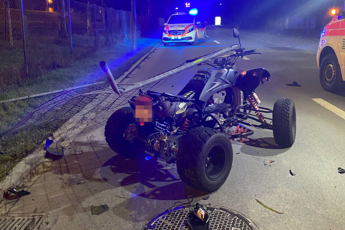 Ein Quad-Fahrer war gegen 6 Uhr auf der Oberwiesenstrasse in Richtung Weststrasse unterwegs. Aus noch ungeklärten Gründen verlor er die Kontrolle über das Fahrzeug, geriet über die Gegenfahrbahn und prallte in einen Zaun. Dabei zog sich der Mann schwere Verletzungen zu. Nach erster Hilfeleistung durch Passanten sowie einer Polizeipatrouille musste der 22-Jährige durch den Rettungsdienst ins Spital gebracht werden.