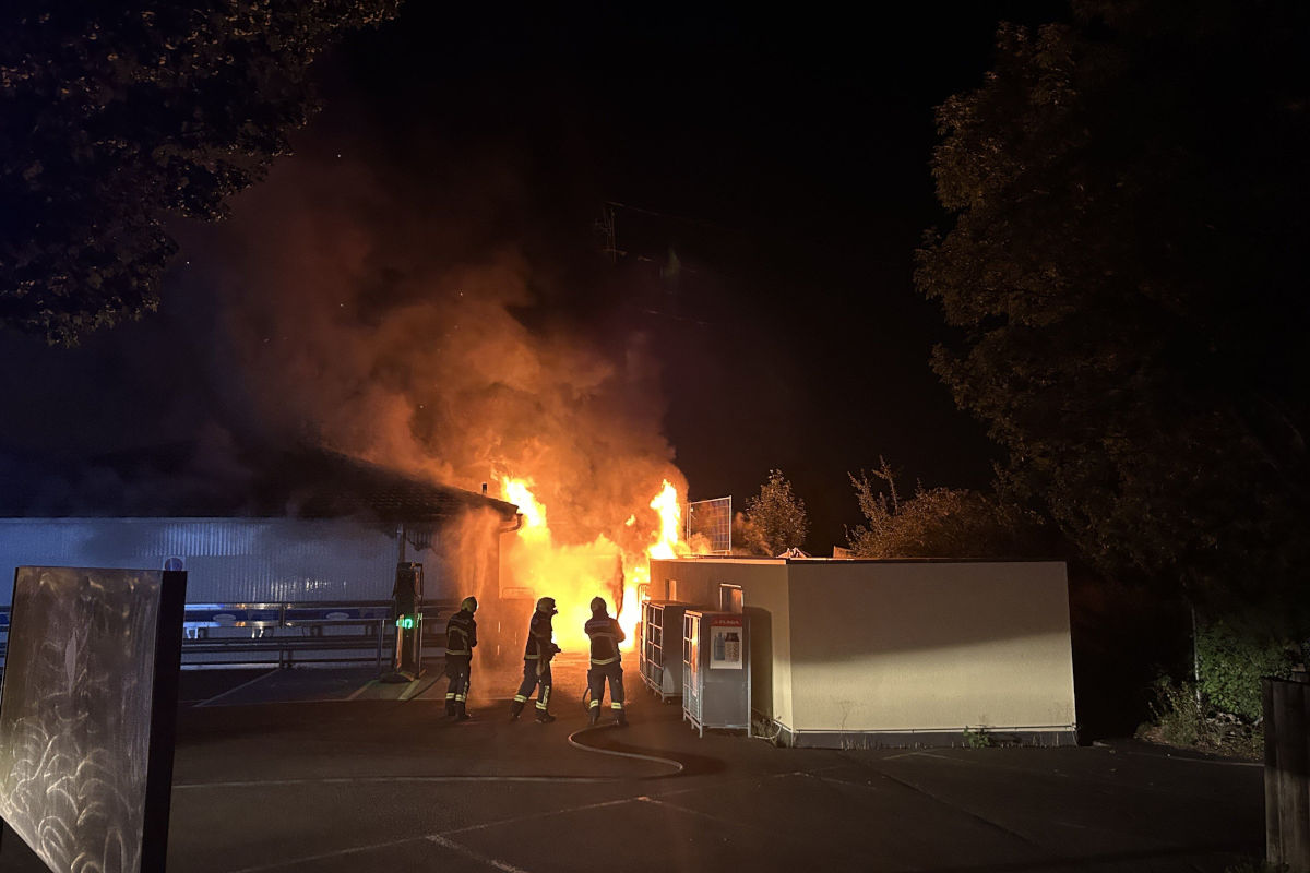 Nur fünf Minuten später sah eine Augenzeugin bei der Migrolino-Tankstelle ausserhalb von Wohlen Flammen. Als die Feuerwehr kurz danach eintraf, brannte es im Aussenlager hinter dem Shop lichterloh, und bereits hatte der Brand auf das Gebäude übergegriffen. Zudem stand eine Gitterbox zwischen den Tanksäulen in Flammen. Obwohl die Feuerwehr den Brand rasch entstand enormer Schaden.