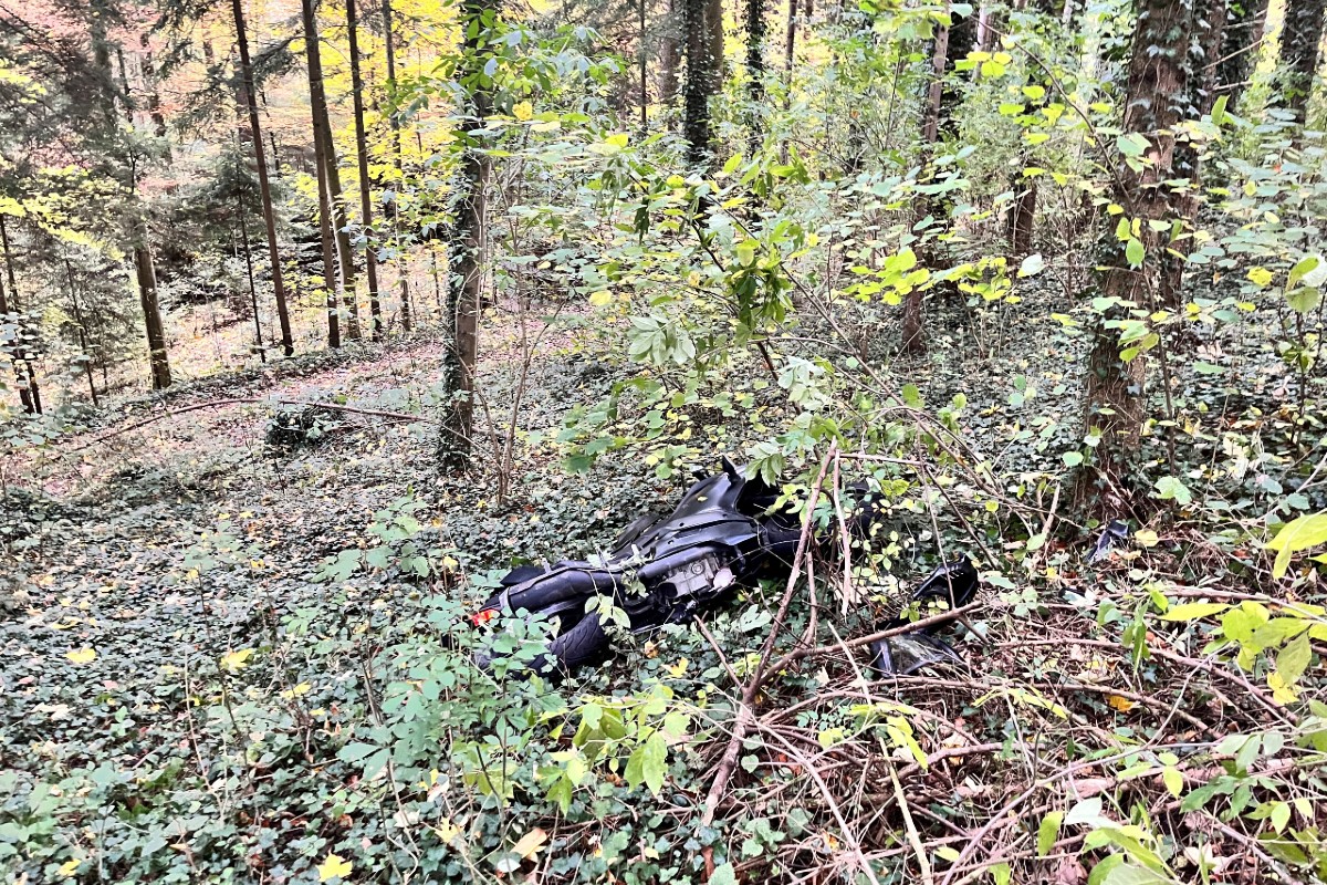 Gegen 7 Uhr fuhr ein Motorradfahrer auf der Lochlistrasse in Richtung Gachnang. Aus noch unbekannten Gründen kam er in einer Rechtskurve des Waldstücks links von der Strasse ab.