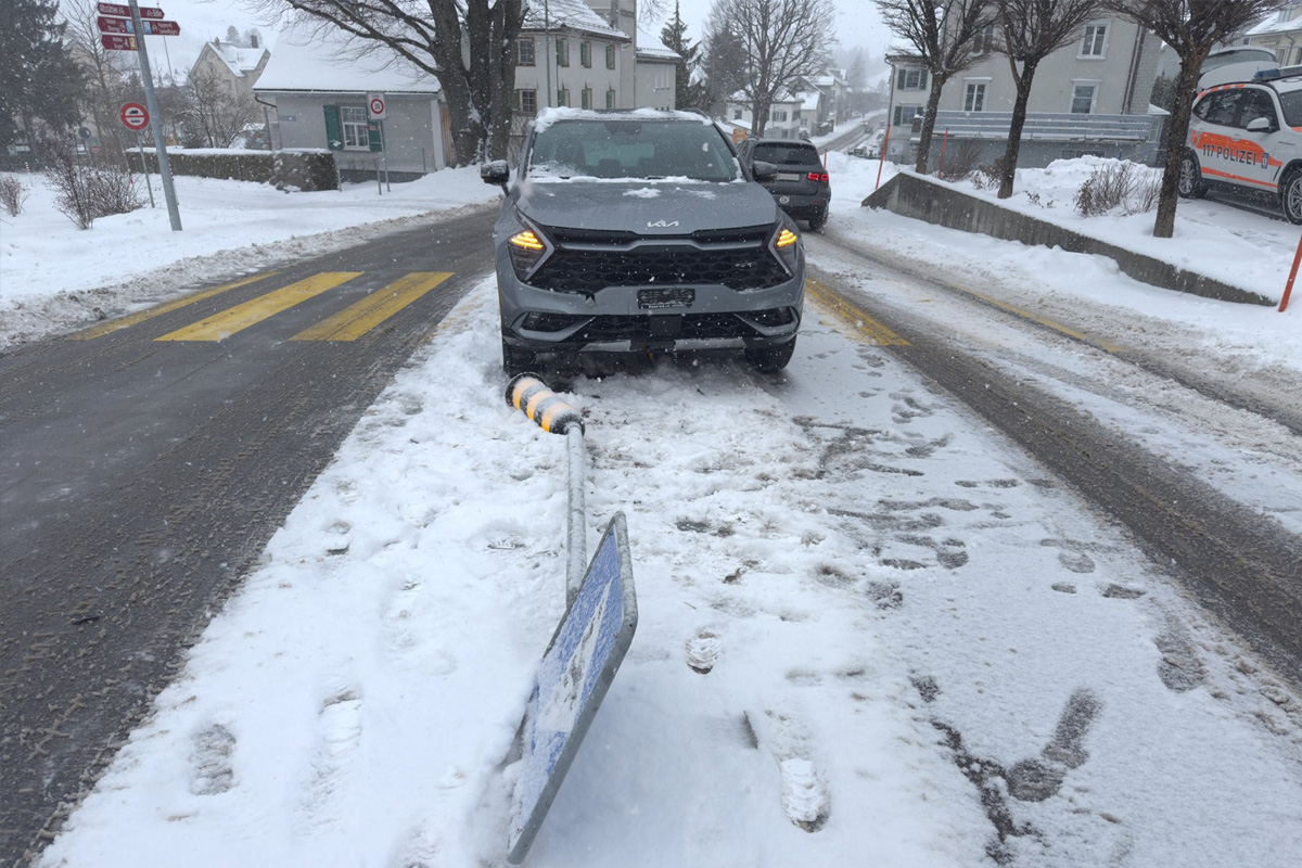 In Gais ist am Samstag eine Autolenkerin auf die Mittelinsel geraten und gegen zwei Schneestangen sowie eine Fussgängertafel geprallt. Verletzt wurde niemand, die Feuerwehr rückte wegen auslaufendem Öl aus.