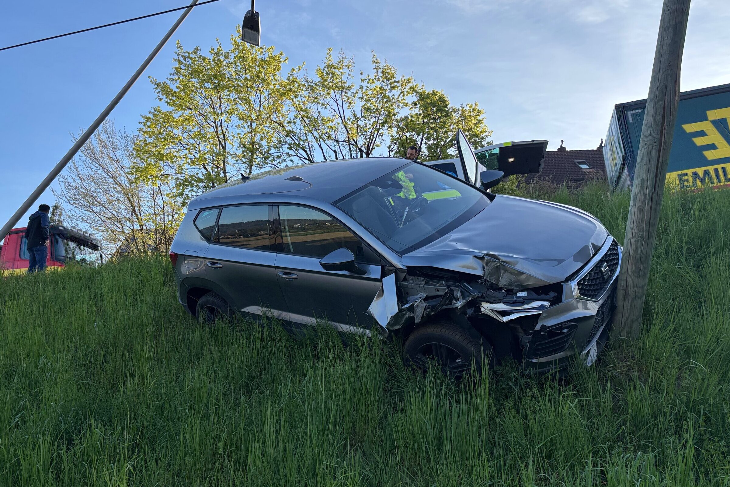 Das Vorhaben missglückte jedoch und der Seat kam rechts von der Strasse ab. Einen ersten Kandelaber knickte das Auto noch um, kam dann aber am Holz-Strommasten im Hang zum Stillstand.