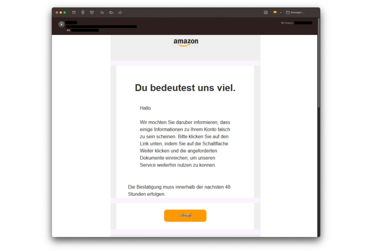 "Du bedeutest uns viel", so beginnt die Ansprache im Phishing-Mail, die vermeintlich von Amazon stammt. Um weiterhin auf den Account zugreifen zu können, werden die potenziellen Opfer unter Zeitdruck gesetzt. Es wird verlangt, dass die persönlichen Daten auf einer imitierten Amazon-Website aktualisiert werden.