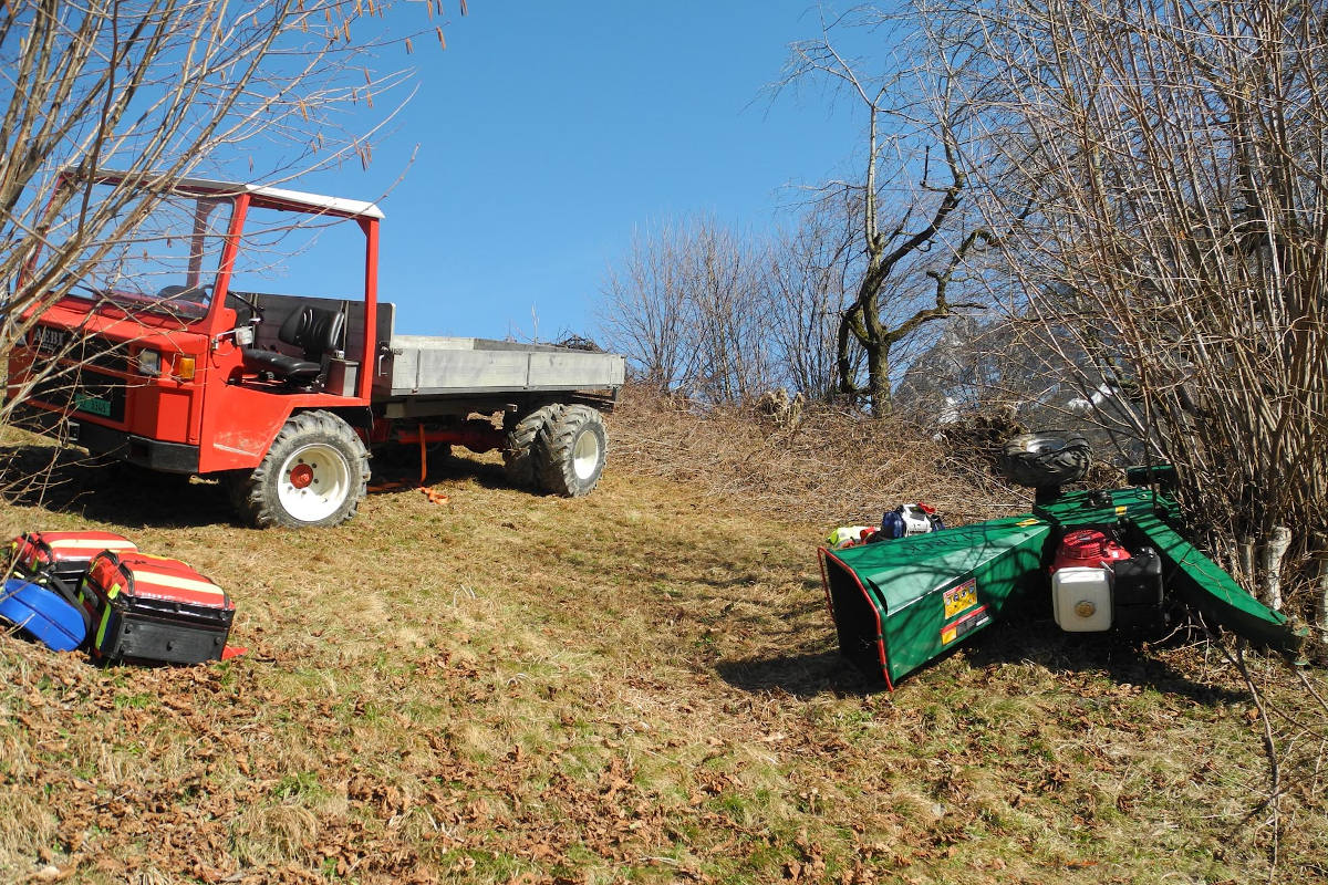 Am Samstag, 20. Februar 2021, wollte ein 54-jähriger Mann um 11.45 Uhr einen Häcksler ab einem Motorkarren, der im unwegsamen und abfallendem Gelände stand, abladen.