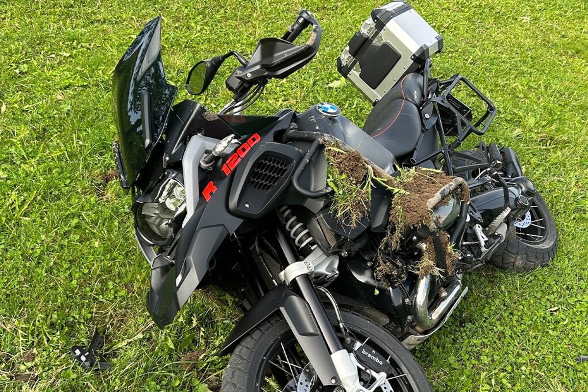 Der Motorradfahrer stürzte ins angrenzende Wiesland (Bildquelle: Kantonspolizei Obwalden)
