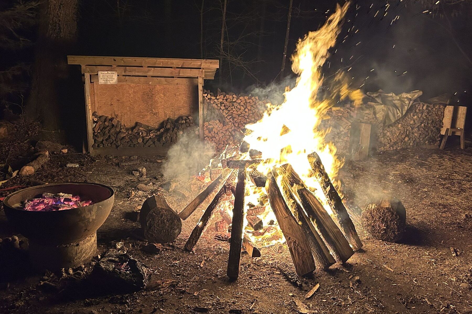 erstellten sie auf dem Boden direkt neben der Feuerstelle mit mehreren Baumstämmen ein Blockfeuer,