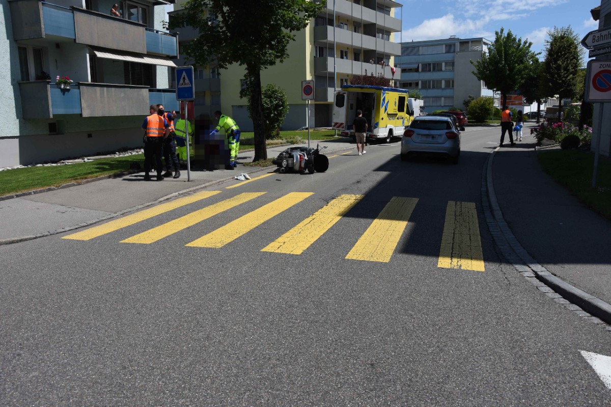 Gleichzeitig fuhr jedoch der 56-jährige Mann mit seinem Roller auf der Poststrasse/Quellenhofstrasse Richtung Verzweigung und beabsichtigte diese ebenfalls zu überqueren. Dabei prallte das Auto gegen die Seite des Motorrades, wodurch der Motorradfahrer zu Fall kam. Er zog sich eher leichte Verletzungen zu und musste vom Rettungsdienst ins Spital gebracht werden.