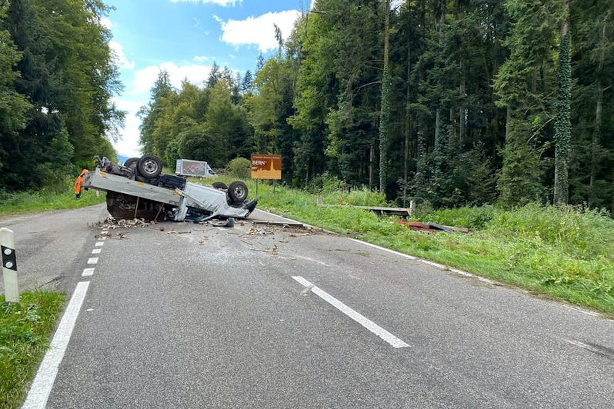 Das Zugfahrzeug kam auf der Strasse auf dem Dach zu liegen, der Anhänger geriet ins anliegende Wiesland (Bildquelle: Kantonspolizei Bern)