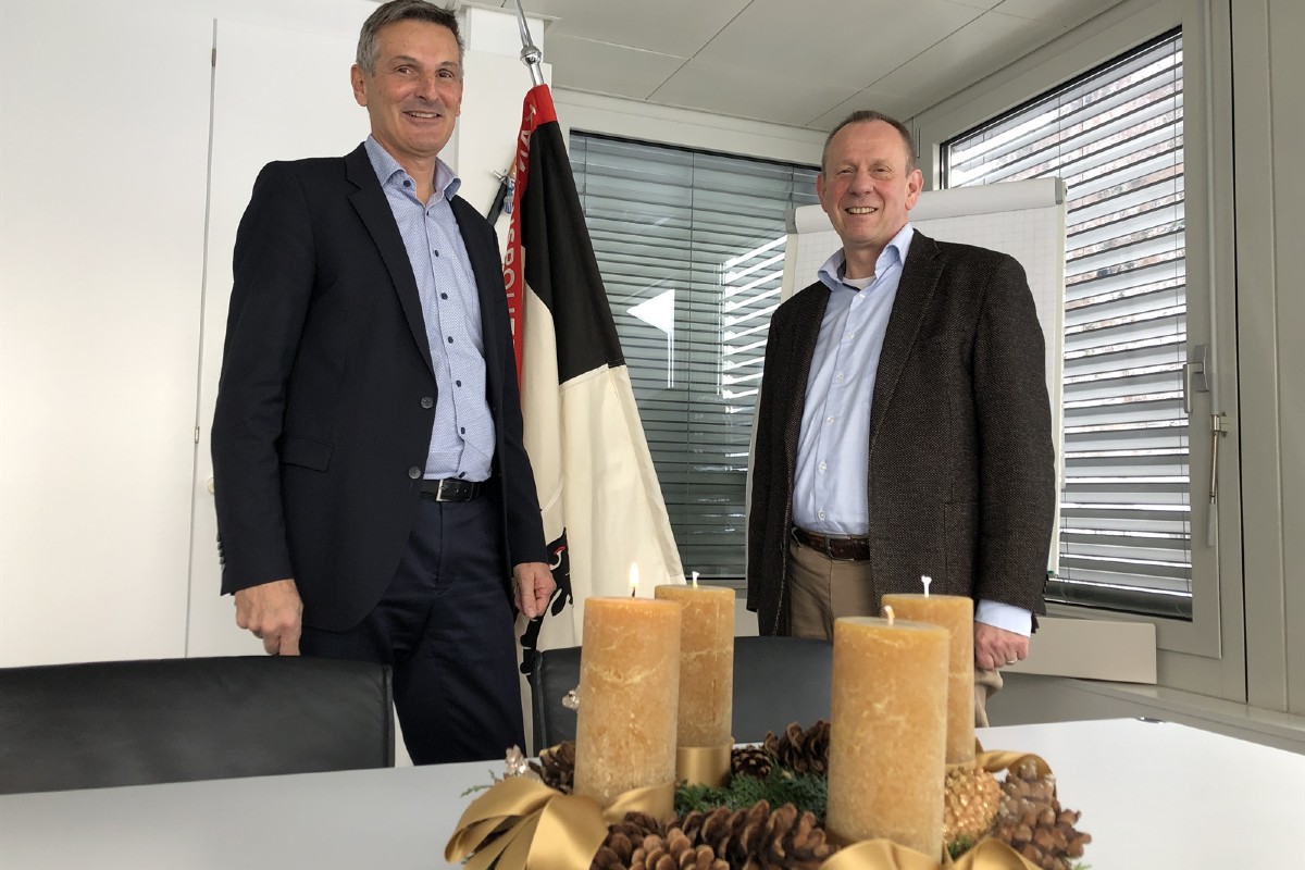 Walter Schlegel und Bruno Zanga bei der Geschäftsübergabe am 29. November 2021 in Chur GR, (Bildquelle: Kantonspolizei Graubünden)