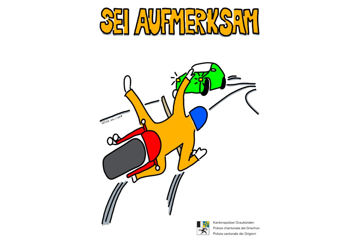 Zwischen Mai und Oktober, also zur eigentlichen Motorradsaison, sind entlang vielbefahrener und unfallträchtiger Motorradstrecken Verkehrssicherheitsplakate angebracht. Die seit Jahren gemeinsam mit dem Tiefbauamt Graubünden durchgeführte Plakataktion richtet sich an alle Verkehrsteilnehmenden.