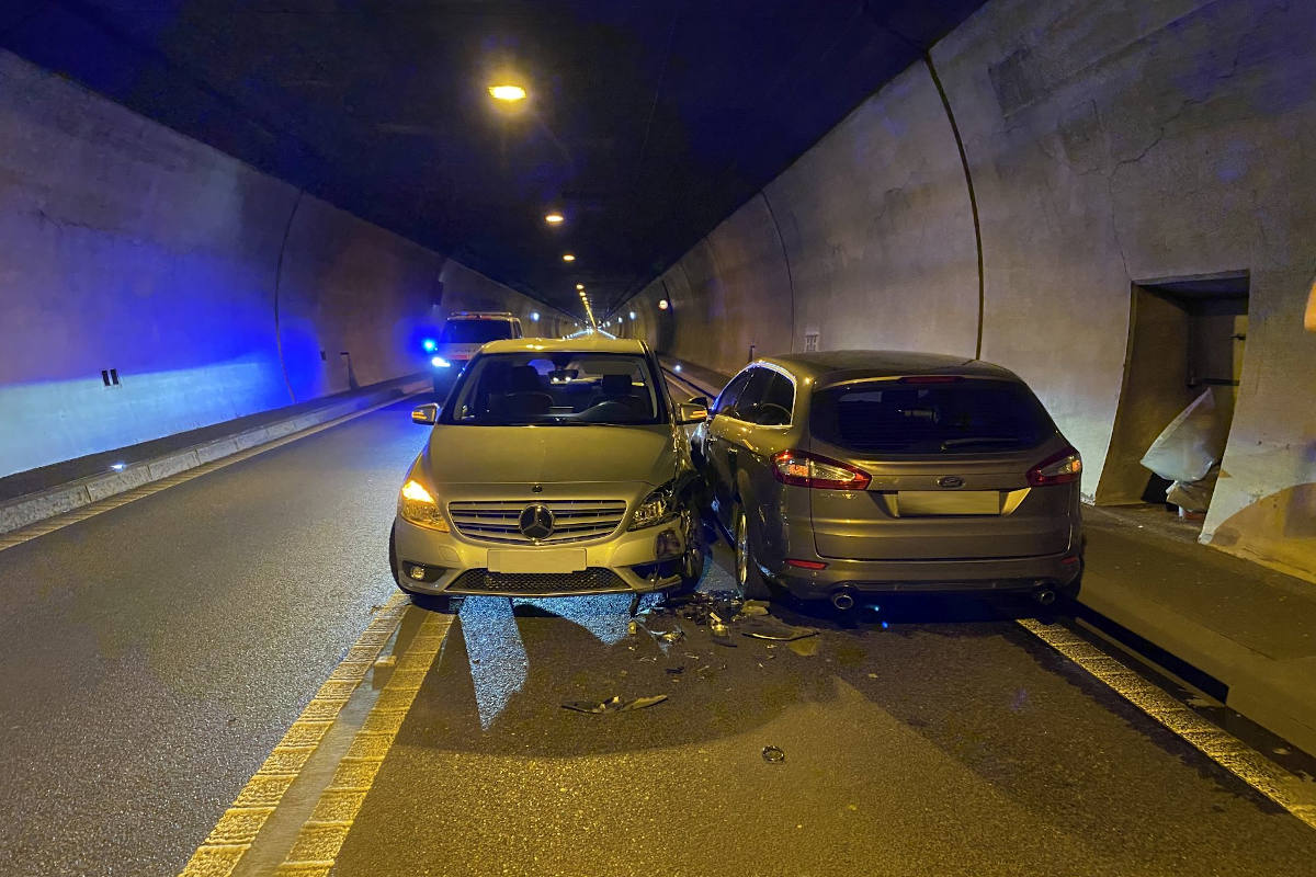 Kollision zwischen zwei Personenwagen im Eggfluhtunnel (Bildquelle: Polizei Basel-Landschaft)