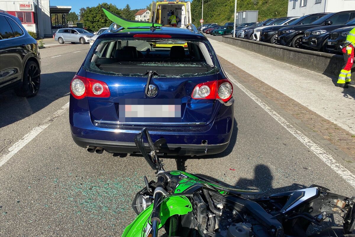 Auf der Oltnerstrasse in Gretzenbach prallte am Montag, 4. September 2023, ein Motorradlenker in das Heck eines Autos, das auf einen Parkplatz abbiegen wollte. Dabei wurde der Motorradlenker verletzt.
