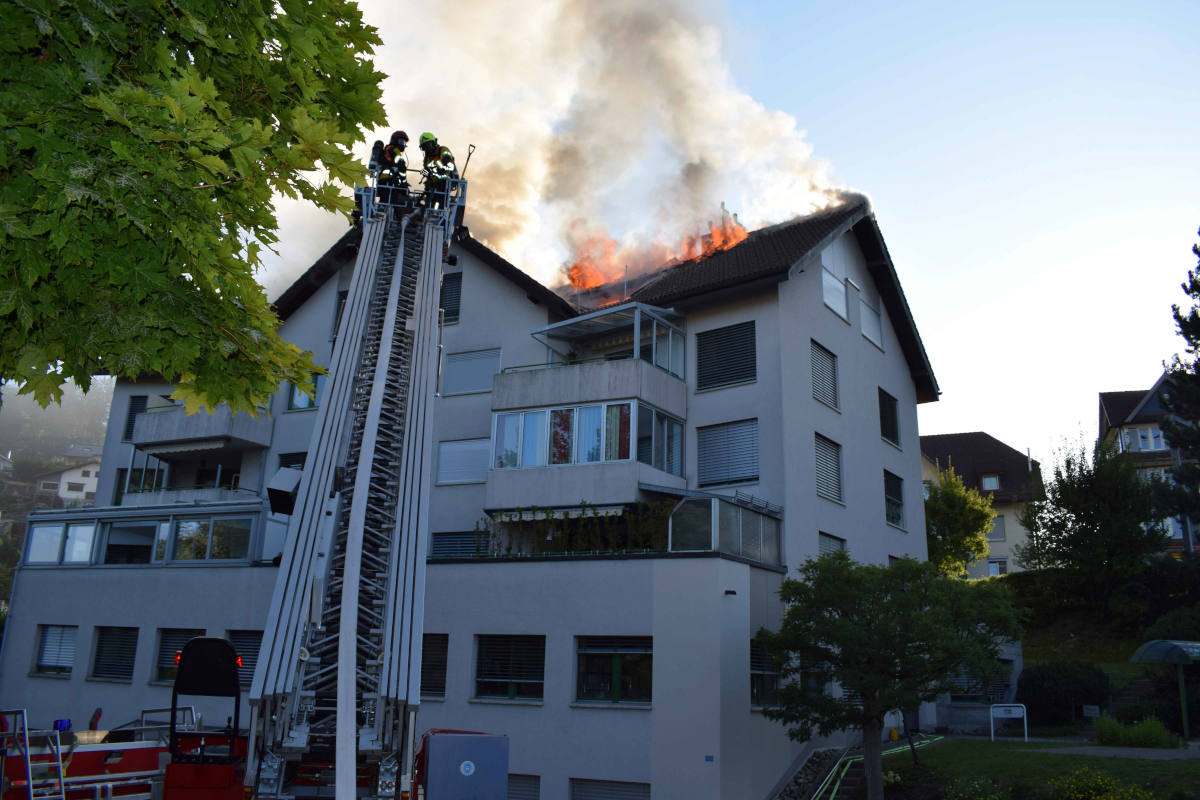 Kurz vor 07:00 Uhr ging bei der Kantonalen Notrufzentrale in Herisau die Meldung ein, dass in Herisau an der Tobelackerstrasse ein Mehrfamilienhaus brenne. Die aufgebotenen Einsatzkräfte stellten bei ihrem Eintreffen am Brandort fest, dass offene Flammen aus dem Dach des Wohn- und Geschäftshauses schlugen. Zeitgleich mit der eingeleiteten Bandbekämpfung wurden die Bewohner aus dem Haus in Sicherheit gebracht. Die zwölf anwesenden Bewohner der acht Wohnungen konnten das Haus unverletzt verlassen und in Sicherheit gebracht werden. Die Einsatzkräfte der Feuerwehr Herisau konnten den Brand mit Unterstützung eines Hubretters der Feuerwehr Gossau löschen. Der Sachschaden wird auf mehrere Hunderttausend Franken geschätzt.