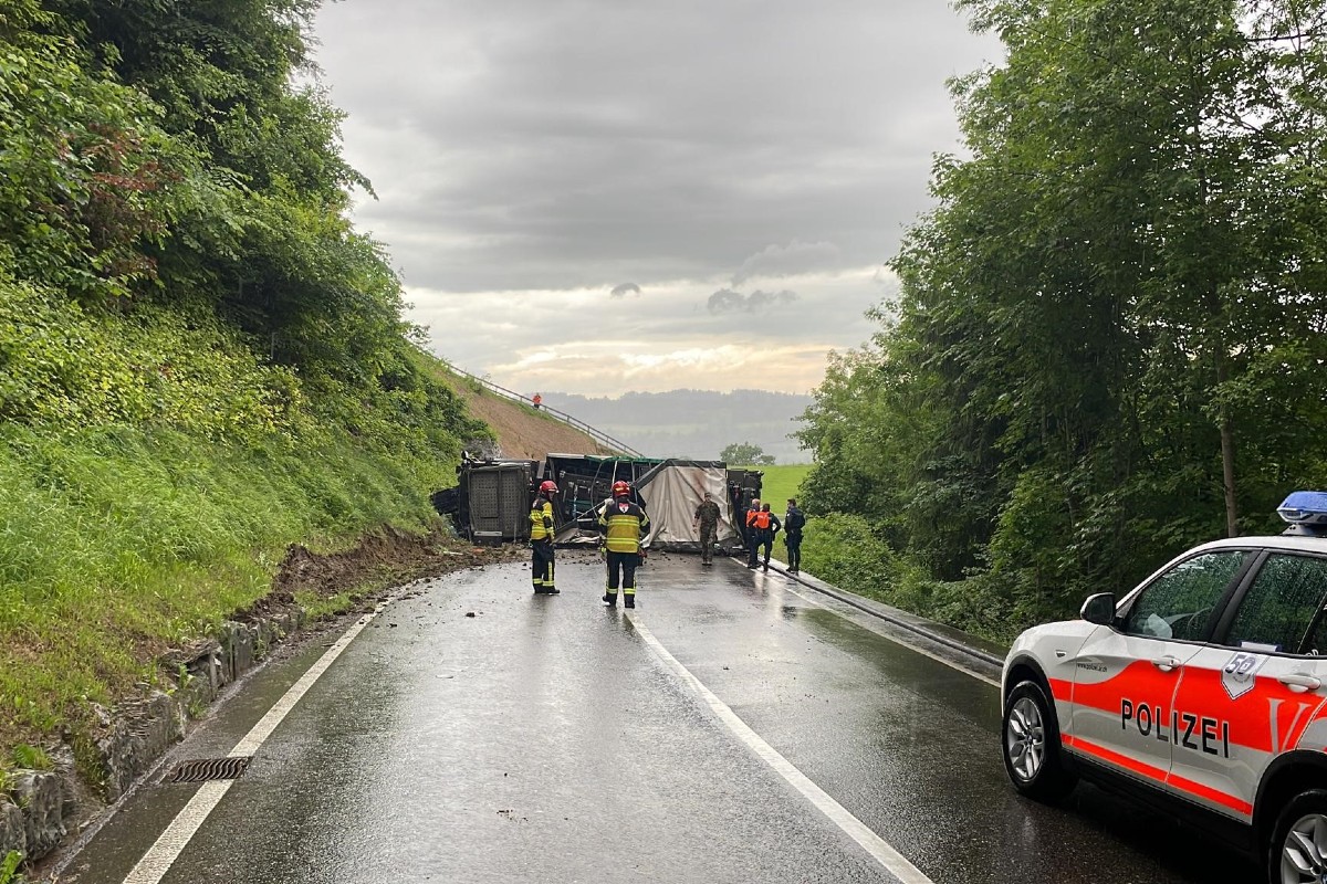 Der Lastwagen geriet über die Gegenfahrbahn in das ansteigende Wiesenbord und kippt anschliessend auf die Seite. Der Lastwagen rutschte auf der nassen Fahrbahn weiter und kam quer zur Fahrbahn liegend zum Stillstand, wodurch diese vollständig blockiert wurde. Der Lenker des Fahrzeuges erlitt leichte Verletzungen und wurde mit der Ambulanz ins Spital überführt. Der Beifahrer blieb unverletzt. Es entstand ein Sachschaden von mehreren Zehntausend Franken.
