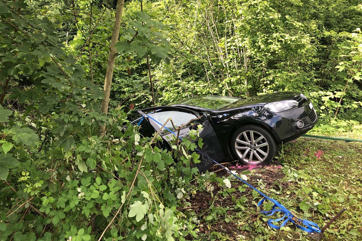 Das Auto geriet rückwärts über den Abhang, der ein Gefälle von 70 bis 80 Prozent aufweist, stiess dabei einen grösseren Baum um und blieb an einem Baumstrunk hängen. Hinter dem Baumstrunk fällt das Gelände praktisch senkrecht sechs Meter in einen Bach ab.