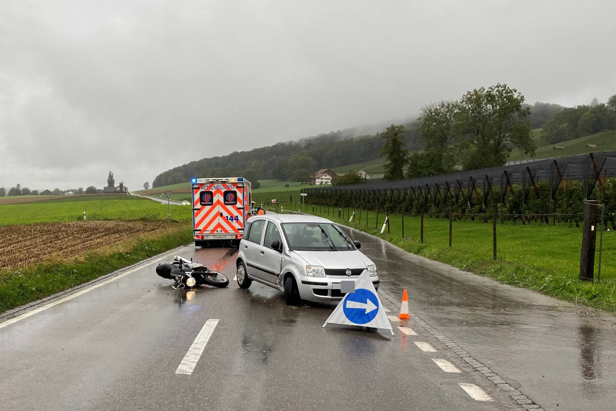 Beim Zusammenstoss zwischen einem Auto und einem Motorrad wurde am Mittwoch in Hüttwilen ein Motorradfahrer mittelschwer verletzt. Er musste ins Spital gebracht werden.