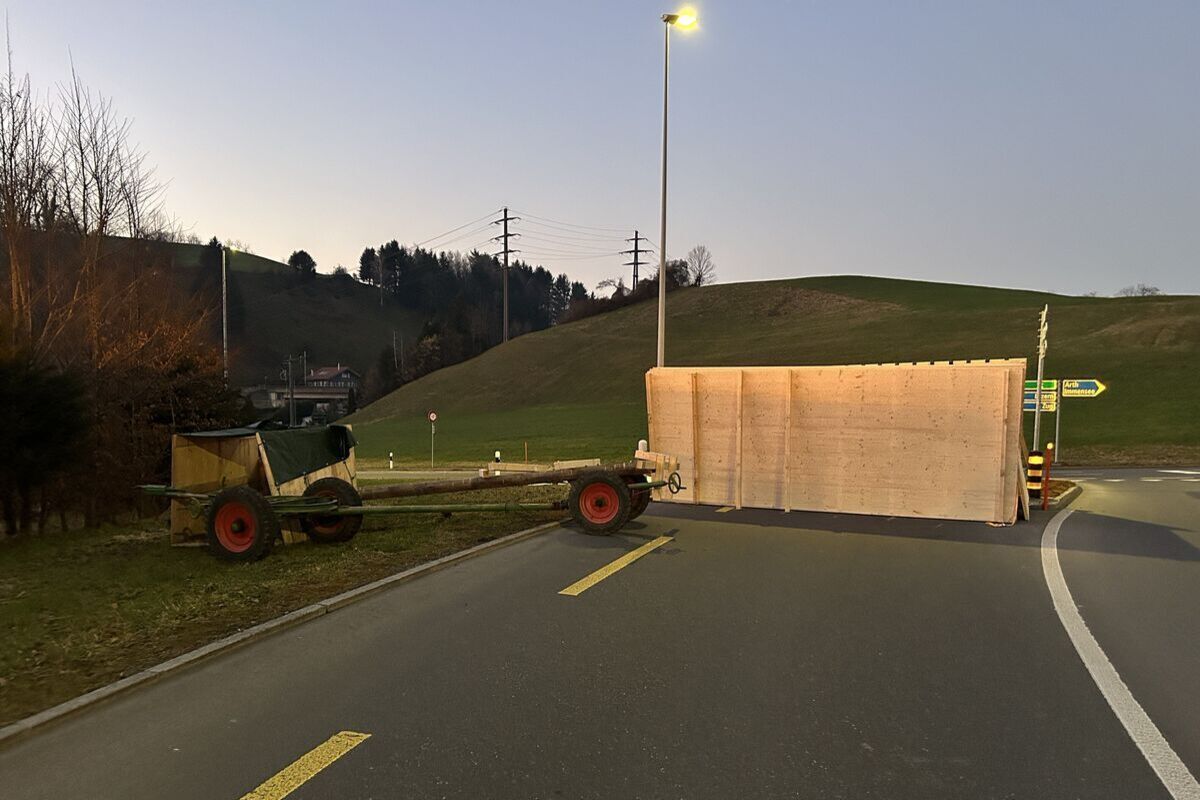 Dabei touchierte das Holzhaus, welches auf dem Anhänger mitgeführt wurde, einen Strassenkandelaber. Infolgedessen kippte das Holzhaus von der Ladefläche des Anhängers und blockierte rund eine Stunde die Strasse. Beim Unfall wurde niemand verletzt.