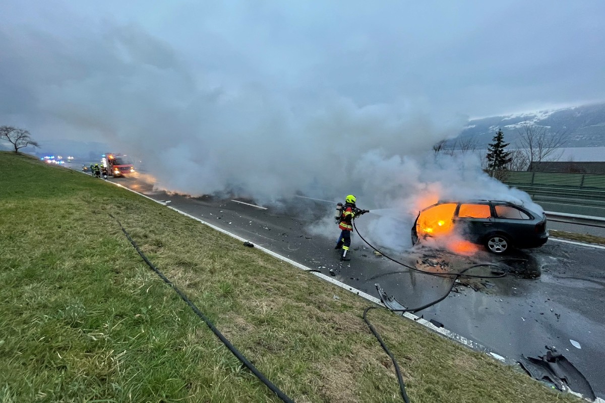 Nach Unfall Feuer gefangen. (Bildquelle: Kantonspolizei Schwyz)