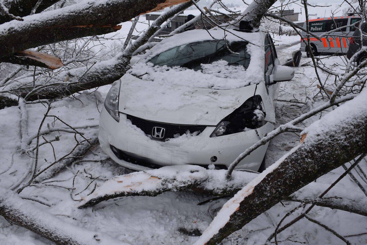 Auf der Sonnenrainstrasse fiel ein schneebedeckter Baum auf ein fahrendes Auto. Drei Personen waren zu diesem Zeitpunkt im Fahrzeug. Ein 3-jähriges Kind wurde verletzt und vom Rettungsdienst 144 ins Spital gefahren. Die umgestürzte Esche hat zudem ein Gebäude und ein parkiertes Auto beschädigt. Der Gesamtsachschaden liegt bei rund 25'000 Franken.