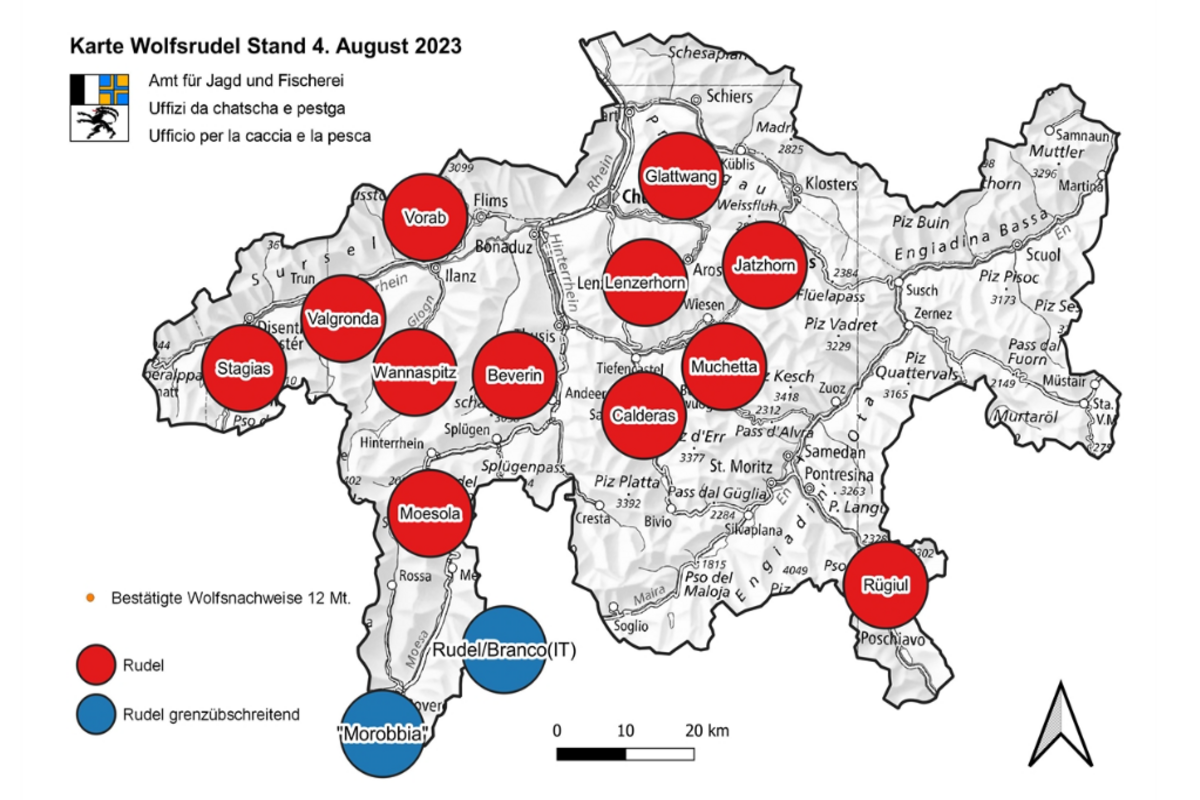 Aktuell leben zwölf Wolfsrudel auf Kantonsgebiet sowie zwei weitere Rudel an der Kantonsgrenze zum angrenzenden Ausland bzw. zum Kanton Tessin. In bislang zehn Rudeln wurde eine Reproduktion bestätigt. Davon acht in bestehenden Rudeln und zwei, die zu einer Rudelbildung geführt haben; eines in Davos (Jatzhornrudel) und eines im Puschlav (Rügiulrudel). Gesamthaft konnten bis Anfang August auf Kantonsgebiet 34 Wolfswelpen sicher nachgewiesen werden. Die jüngste festgestellte Reproduktion im Glattwangrudel zwischen Prättigau und Schanfigg konnte zudem erstmals mittels Auswertung einer Aufnahme von Wolfsgeheul festgestellt werden.