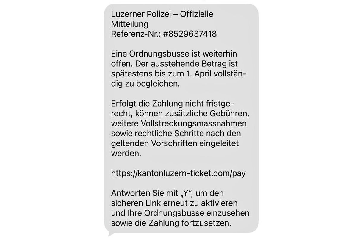 Seit gestern Morgen sind bei der Luzerner Polizei mehrere Meldungen eingegangen, wonach Personen SMS-Nachrichten im Namen der Luzerner Polizei erhalten haben. In diesen Nachrichten wird geltend gemacht, dass eine Ordnungsbusse offen sei und die Zahlungsfrist in Kürze ablaufe.