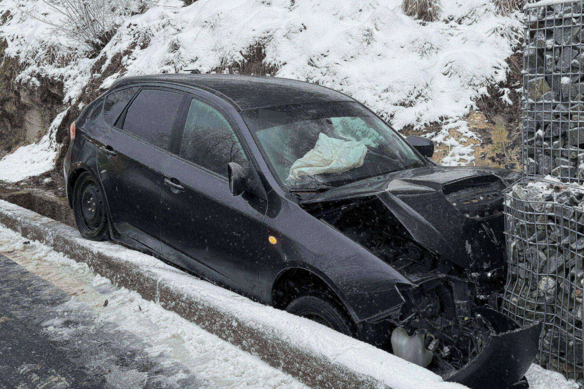 In St. Niklausen auf der Melchtalerstrasse kam ein 24-jähriger Autolenker aufgrund der schneebedeckten Strasse ab der Fahrbahn und kollidierte mit einer Steinmauer. (Bildquelle: Kantonspolizei Obwalden)