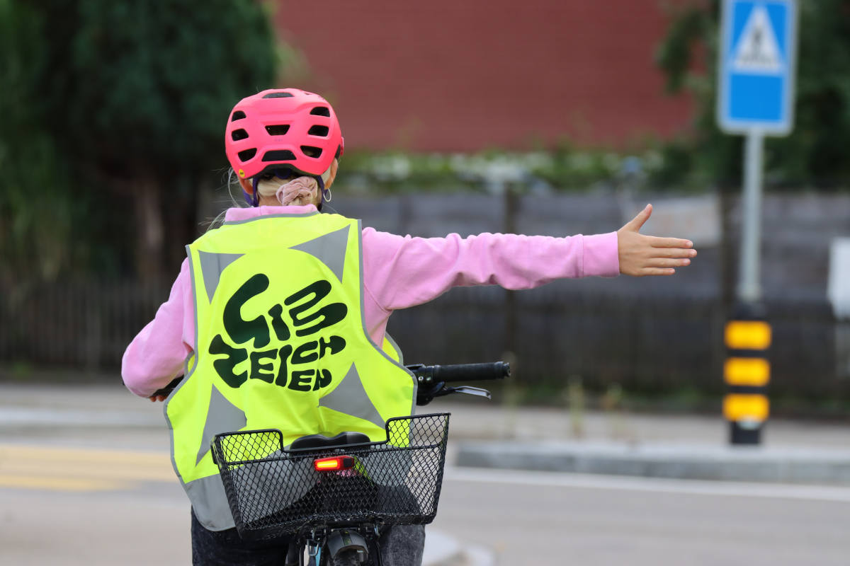 Dieses Jahr ziert eine Hand die Leuchtwesten von "Verkehrssicherheit Thurgau". Es ist der zweite Teil einer Serie, die in den nächsten Jahren das Thema "Miteinander und gegenseitige Rücksichtnahme im Verkehr" fokussiert. Das aktuelle Sujet richtet sich an Velo-, Mofa- oder E-Bike-Fahrende. Der Schriftzug "Gib Zeichen" weist darauf hin, dass jede Richtungsänderung durch ein deutliches Handzeichen angezeigt werden muss. Nur so können die anderen Verkehrsteilnehmer die Absicht rechtzeitig erkennen. Auf einem Wettbewerbstalon, der in jeder Weste enthalten ist, werden die wichtigsten Regeln in Erinnerung gerufen. Die Leuchtwesten sind mit mehreren reflektierenden Elementen ergänzt.