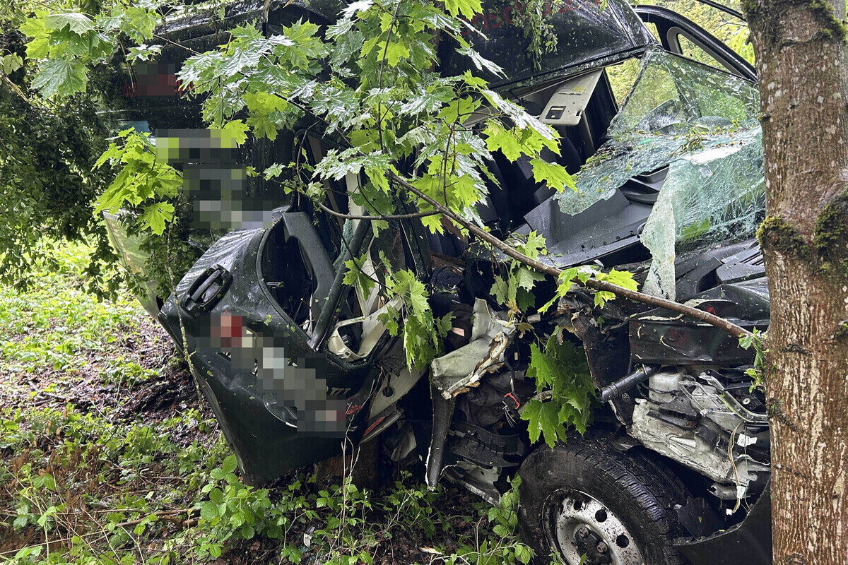 Der 26-Jährige konnte unverletzt aus dem völlig demolierten, in den Bäumen verkeilten Lieferwagen aussteigen. Zu dessen Bergung musste die Feuerwehr Unterstützung leisten.