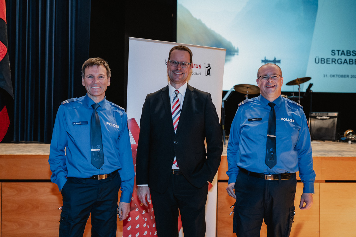 Markus Denzler (Polizeikommandant a.D.), Regierungsrat Christian Marti und Richard Schmidt (neuer Polizeikommandant) (Bildquelle: Kantonspolizei Glarus)