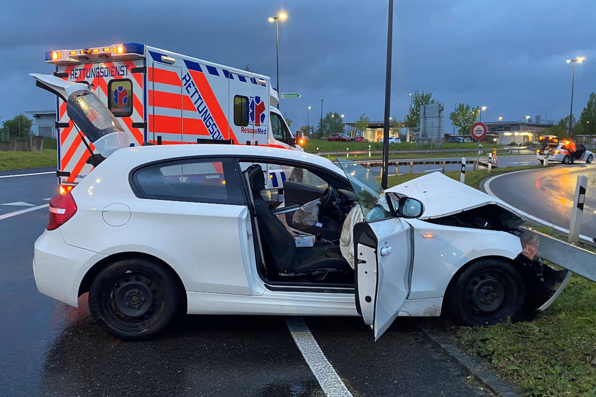 Ein 41-jähriger Autofahrer war kurz vor 5.30 Uhr auf der Autobahn A7 in Richtung Kreuzlingen unterwegs. Aus bislang noch nicht geklärten Gründen fuhr er geradeaus in den Euregiokreisel, durchquerte die Kreisel-Anlage und beschädigte dabei mehrere Betonelemente. Nach mehreren Metern prallte das Fahrzeug in die Leitplanke und kam zum Stillstand.